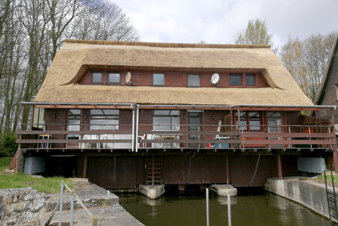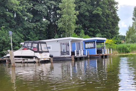 Bootshaus, Hausboot, Ferienhaus mit Bootshaus, Ferienwohnung mit Bootshaus, bebautes Wassergrundstück, Bootsschuppen.