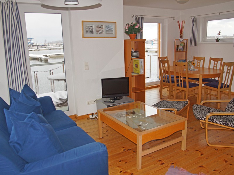 Genießen Sie die besondere maritime Atmosphäre im geräumigen, lichtdurchfluteten Wohnzimmer. Beobachten Sie das Lichtspiel auf dem Wasser oder entspannen Sie sich im Liegestuhl auf dem Balkon. Bereits beim Blick aus dem Fenster sind Sie ganz nah an der Natur: Fische springen, Wasservögel ziehen direkt vor der Terrasse ihre Kreise, gelegentlich sind sogar Seeadler zu sehen.