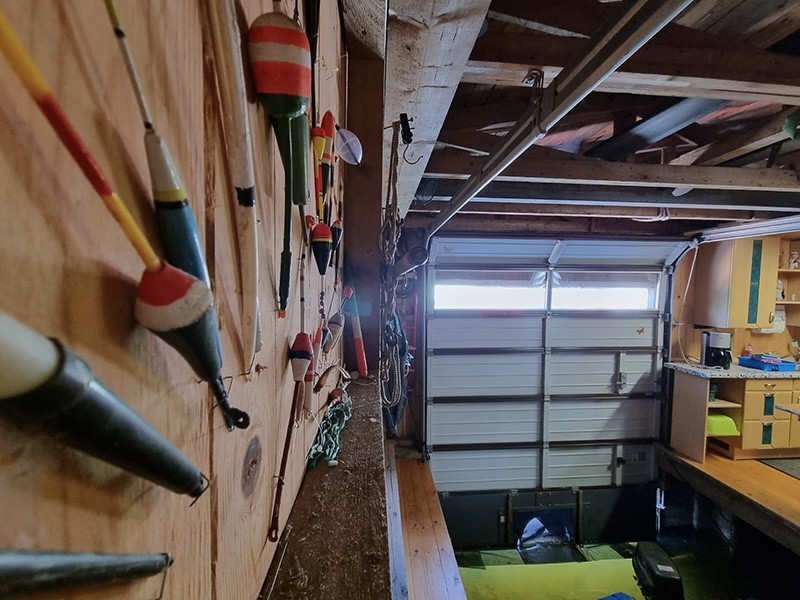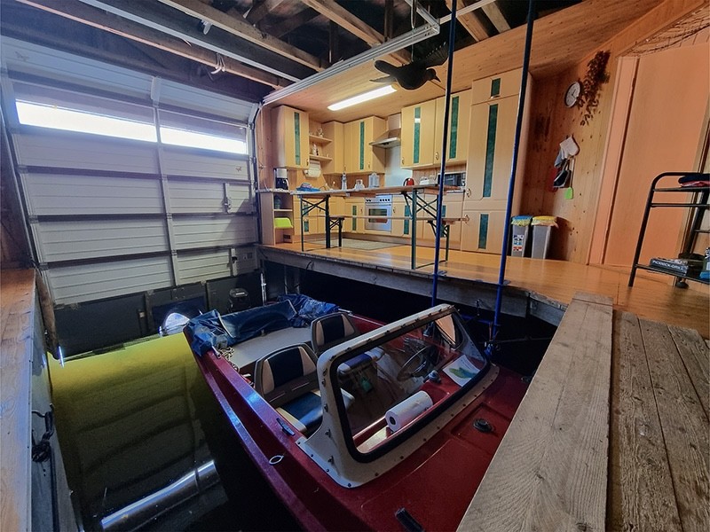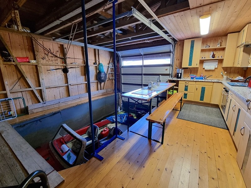 Die Küche und der Bootsliegeplatz (6,0 m x 2,5 m) mit fahrbereitem Motorboot befinden sich in einem Raum, was er Küche einen maritimen Charakter verleiht. Die Küchenzeile ist komplett ausgestattet.