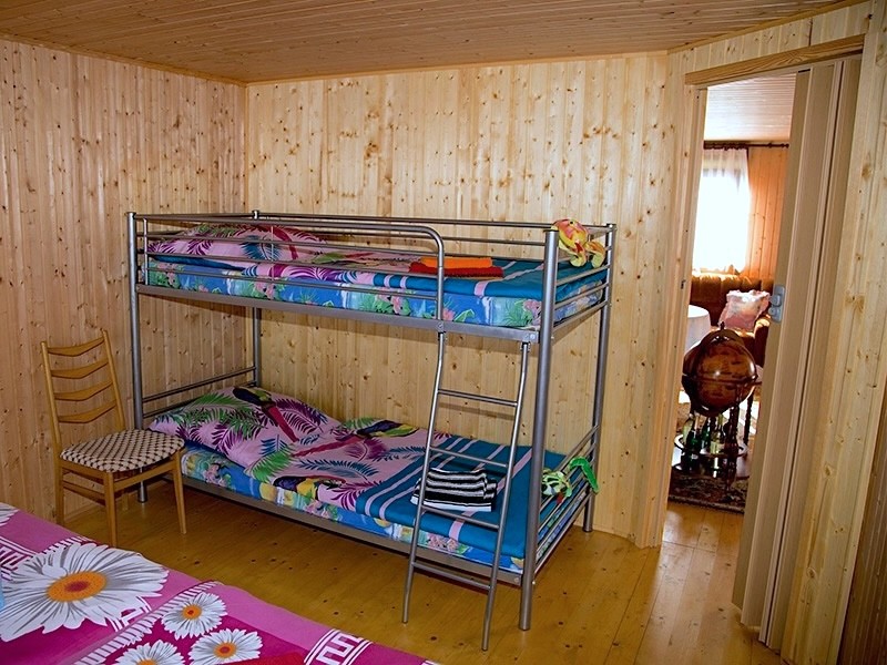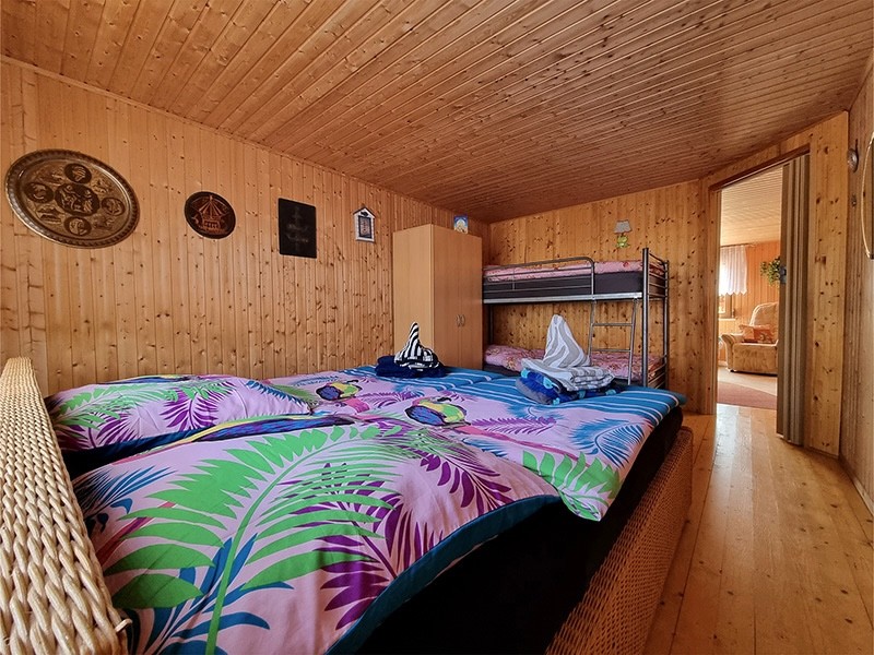 Ein separates Schlafzimmer mit Schlafmöglichkeiten für 4 Personen. Es ist ausgestattet mit 1 Doppelbett und 1 Doppelstockbett.