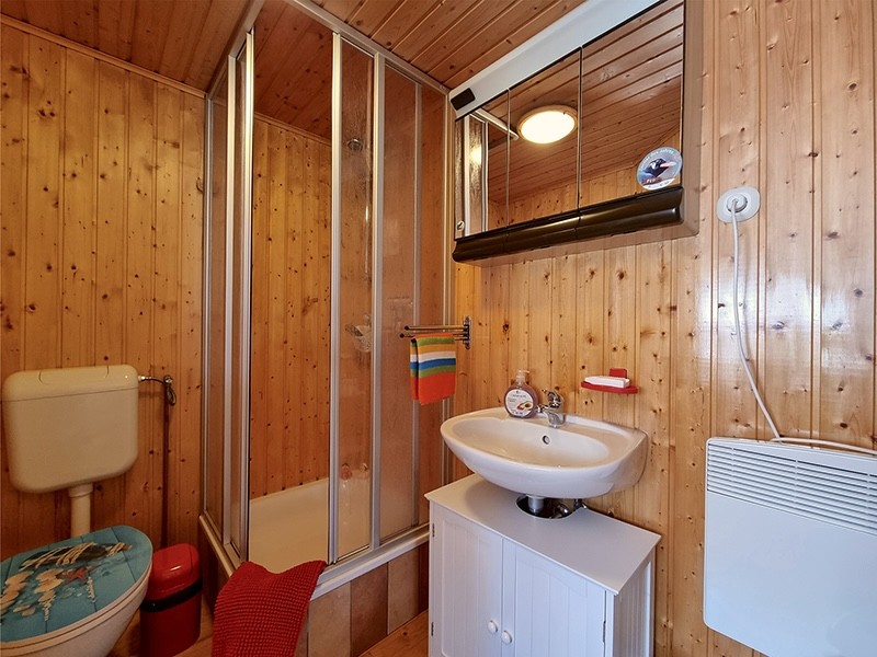 Das Duschbad mit WC ist ausgestattet mit Waschbecken, Spiegelschrank, Handtuchhalter, Fön.