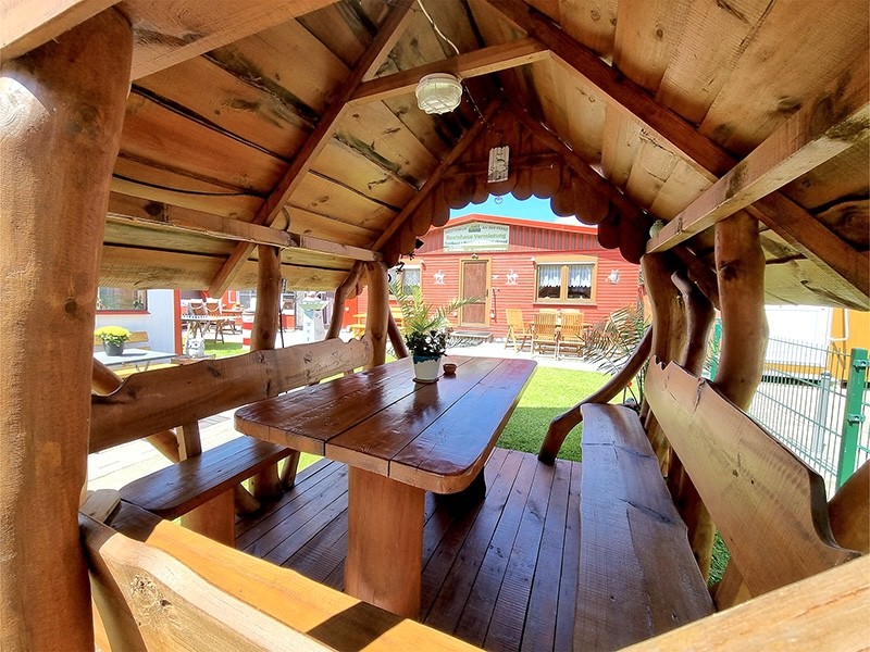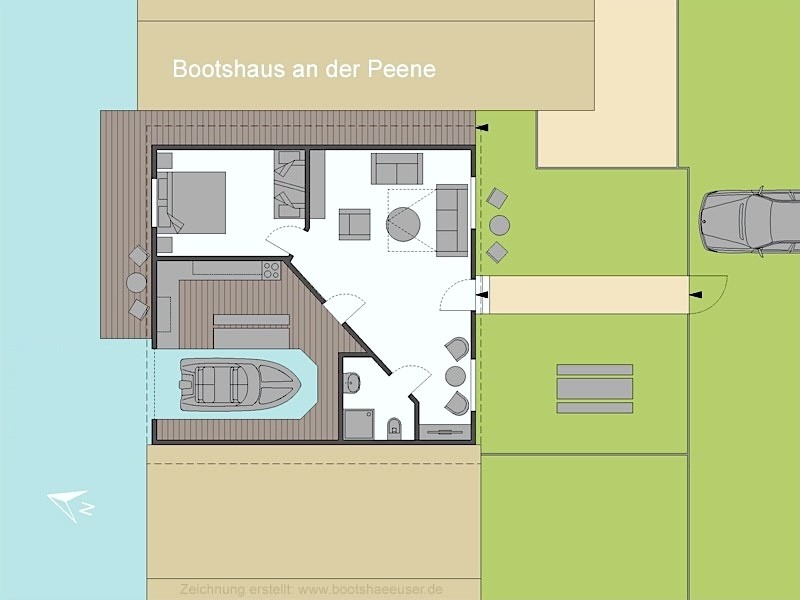 Zum Bootshaus Ferienhaus an der Peene gehört landseitig ein kleiner, eingezäunter Garten mit Rasenfläche (100 qm) und Gartenmöbeln. Es gibt Stellplätze für 2 PKW vor dem Grundstück.