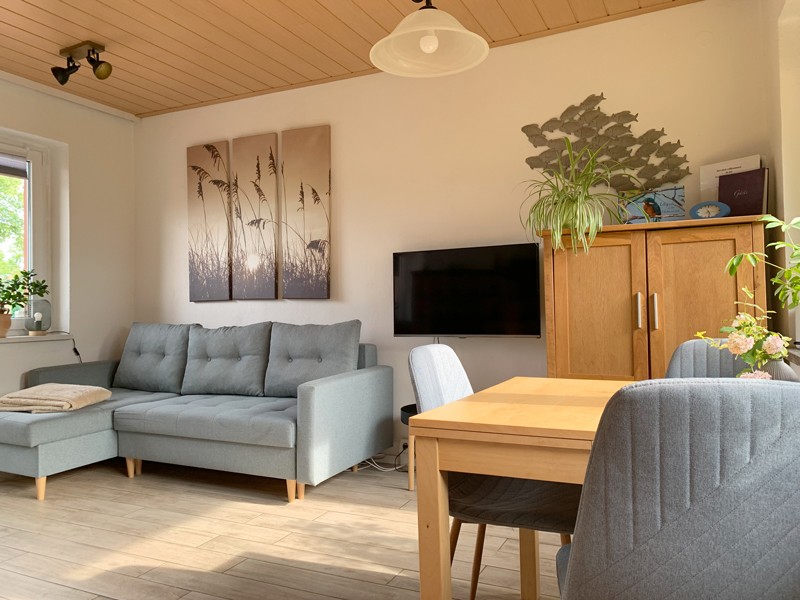 • Wohnzimmer: Esstisch mit Stühlen, TV, Schlafcouch (bequem, ausklappbar, 140 cm breit), offener Kamin / Kachelofen