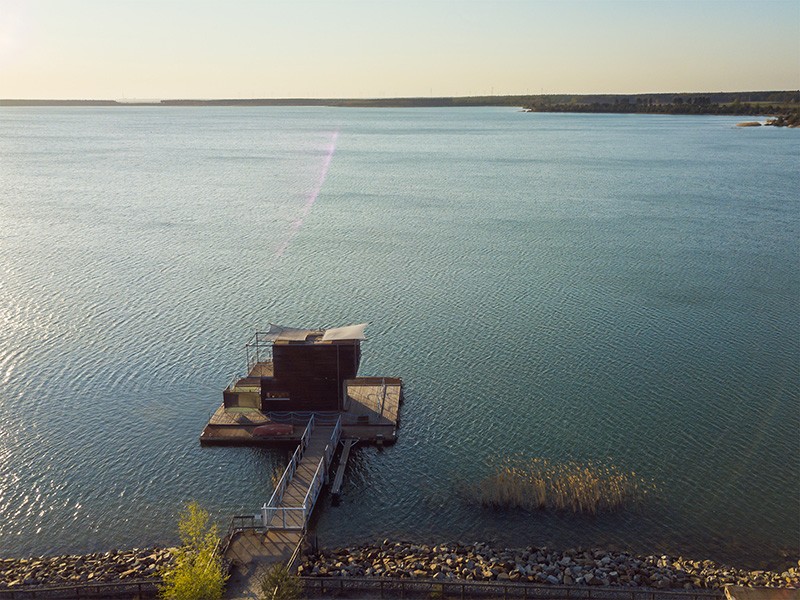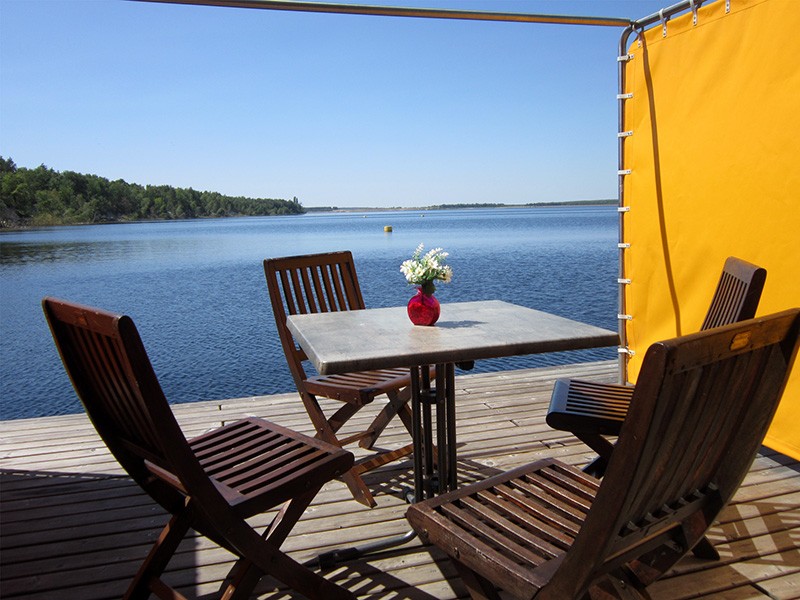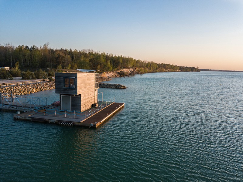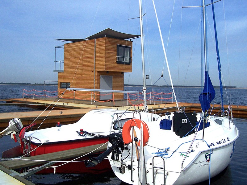 Inmitten des Lausitzer Seenlandes liegt das schwimmende Ferienhaus in Alleinlage an einer kleinen Steganlage auf dem großen Partwitzer See. In der Lausitz entsteht bis 2018 durch die Flutung ehemaliger Braunkohletagebaue in Brandenburg und Sachsen die größte künstliche Wasserlandschaft Europas mit 23 touristisch nutzbaren Seen. Im Kerngebiet werden dann 10 Seen durch schiffbare Kanäle miteinander verbunden sein - aktuell sind es bereits sechs: nutzbar ist bisher der Kanal zwischen Senftenberger See und Geierswalder See.