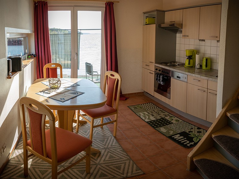 • vollausgestattete Wohnküche mit Küchenzeile und Esstisch für 4 Personen. Die Küchenzeile ist ausgestattet mit Kühlschrank, 4-Platten-Elektroherd, Dunstabzugshaube, Geschirrspüler, Kaffeemaschine,Toaster, Geschirr und Besteck für 6 Personen.