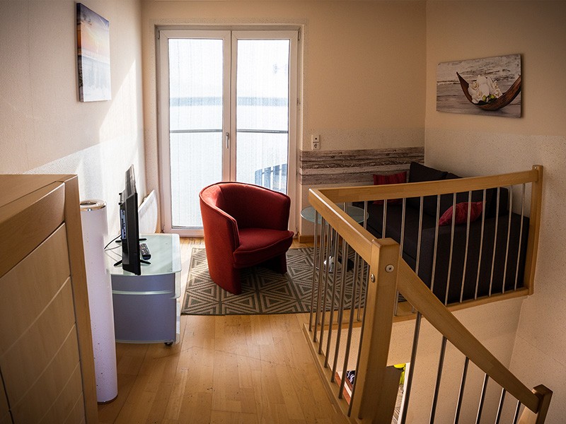 • Wohnraum mit gemütlicher Sitzecke (ausziehbare Couch, Aufbettung möglich) und TV/SAT