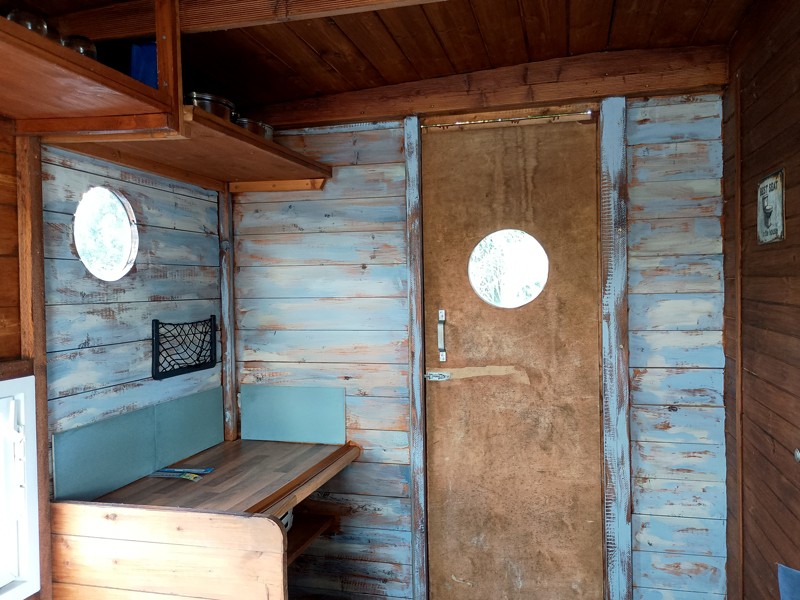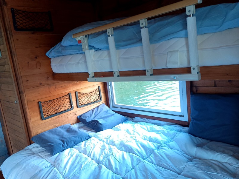 Im Innenraum steht ein fest eingebautes Doppelbett, darüber ein Einzelbett und eine weitere Schlaf- oder Sitzgelegenheit. Die kleine Küchenzeile ist ideal für einfache Mahlzeiten. Ein kleines Bad mit Waschbecken und Toilette ist ebenfalls vorhanden. Viele Staufächer sorgen für Ordnung und Platz.