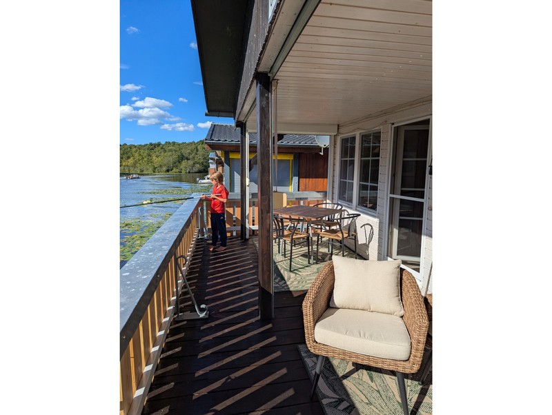 Entspannt auf der gemütlichen Terrasse, lest ein Buch und genießt die Ruhe am Wasser. Spiele und Bücher warten im Bootshaus auf euch.