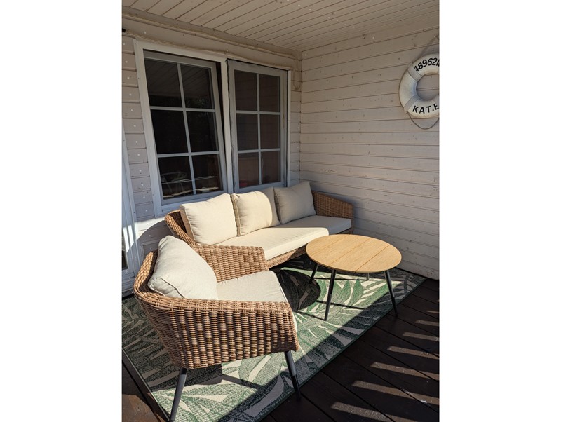 Unsere Terrasse ist, wie das Hausinnere, in zwei Bereiche geteilt. Der größere Bereich hat einen Esstisch und eine gemütliche Sitzecke mit Sofa und Sessel. Der kleine Bereich hat zwei Liegestühle, auf denen du ungestört sonnenbaden kannst.