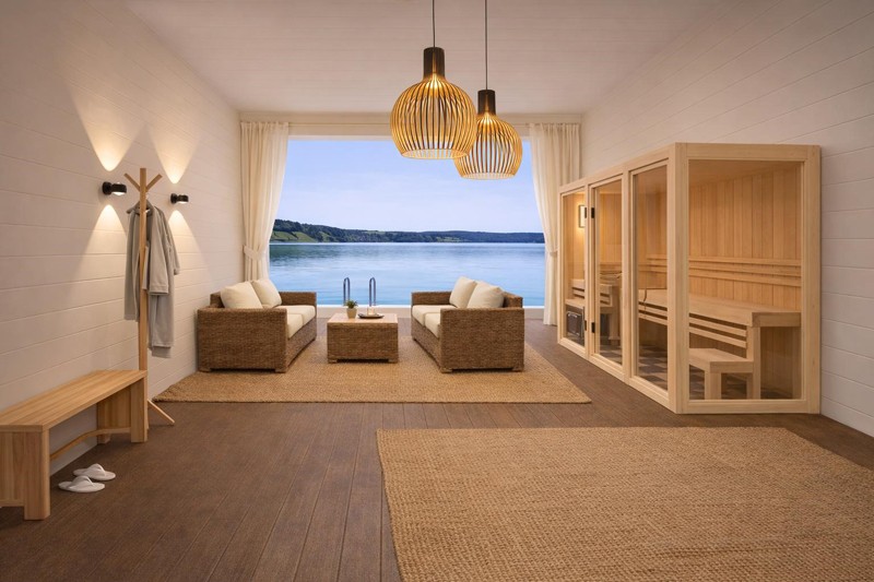 • Loggia (35 qm) mit Sauna, Sitzgruppe und Badetreppe zum See